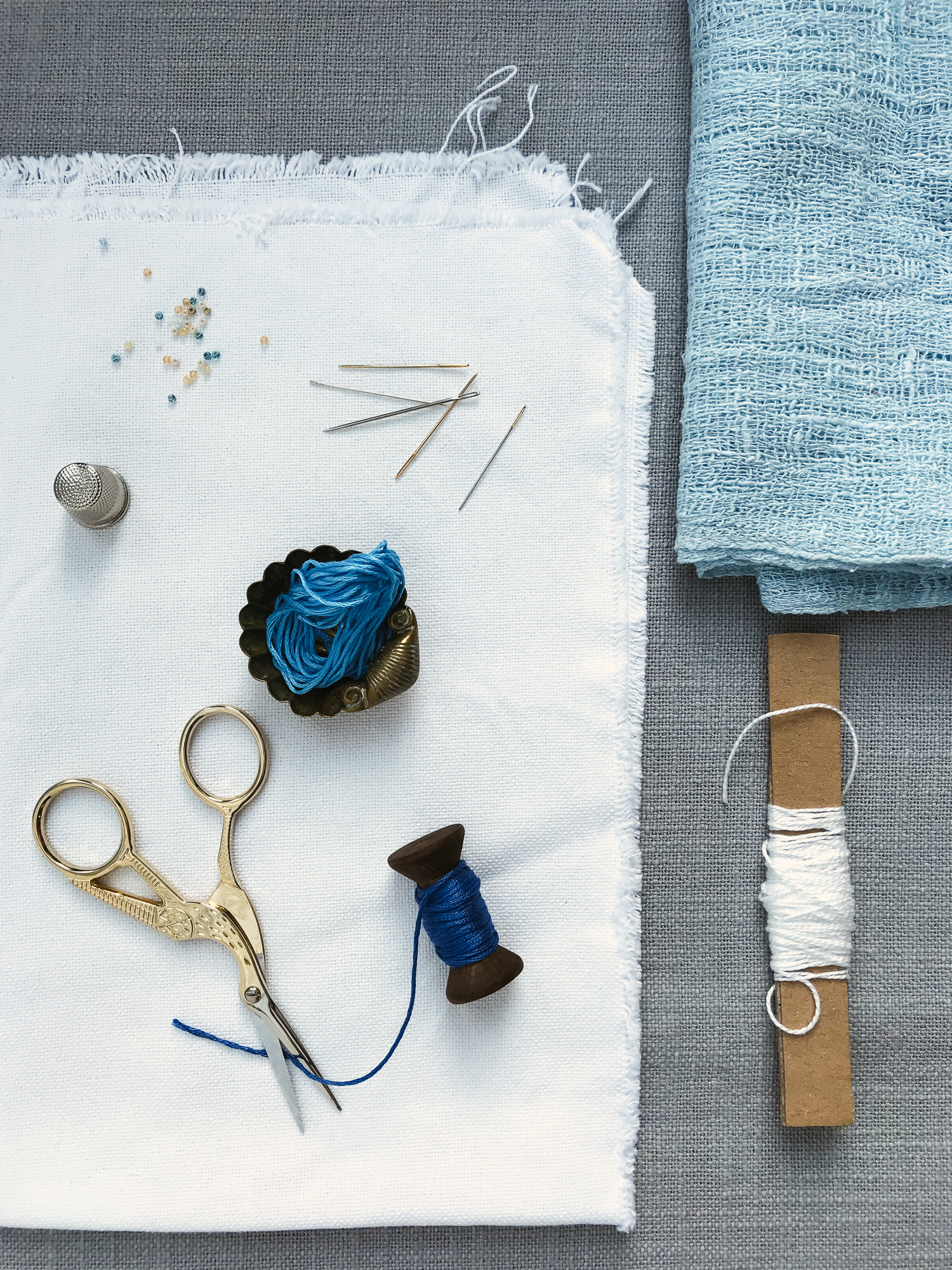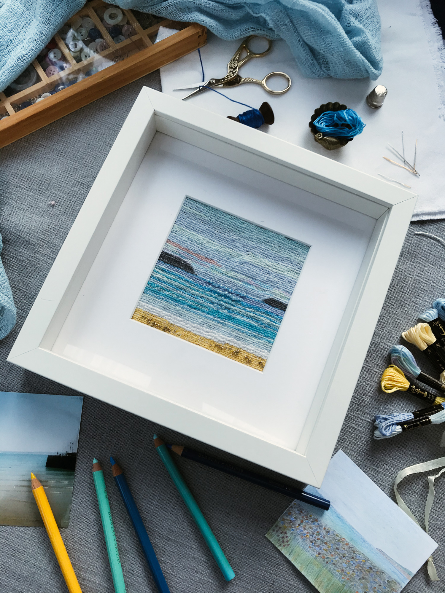 The sea, sky, cliffs, beach, For this project I used Anchor Stranded Cotton threads, but there are a number of other well-known brands. For this project the important factor is to try and find as many complementary shades as possible for the sea and the sky. Like choosing coloured pencils, the shades of the threads create the atmosphere of the sea and sky.