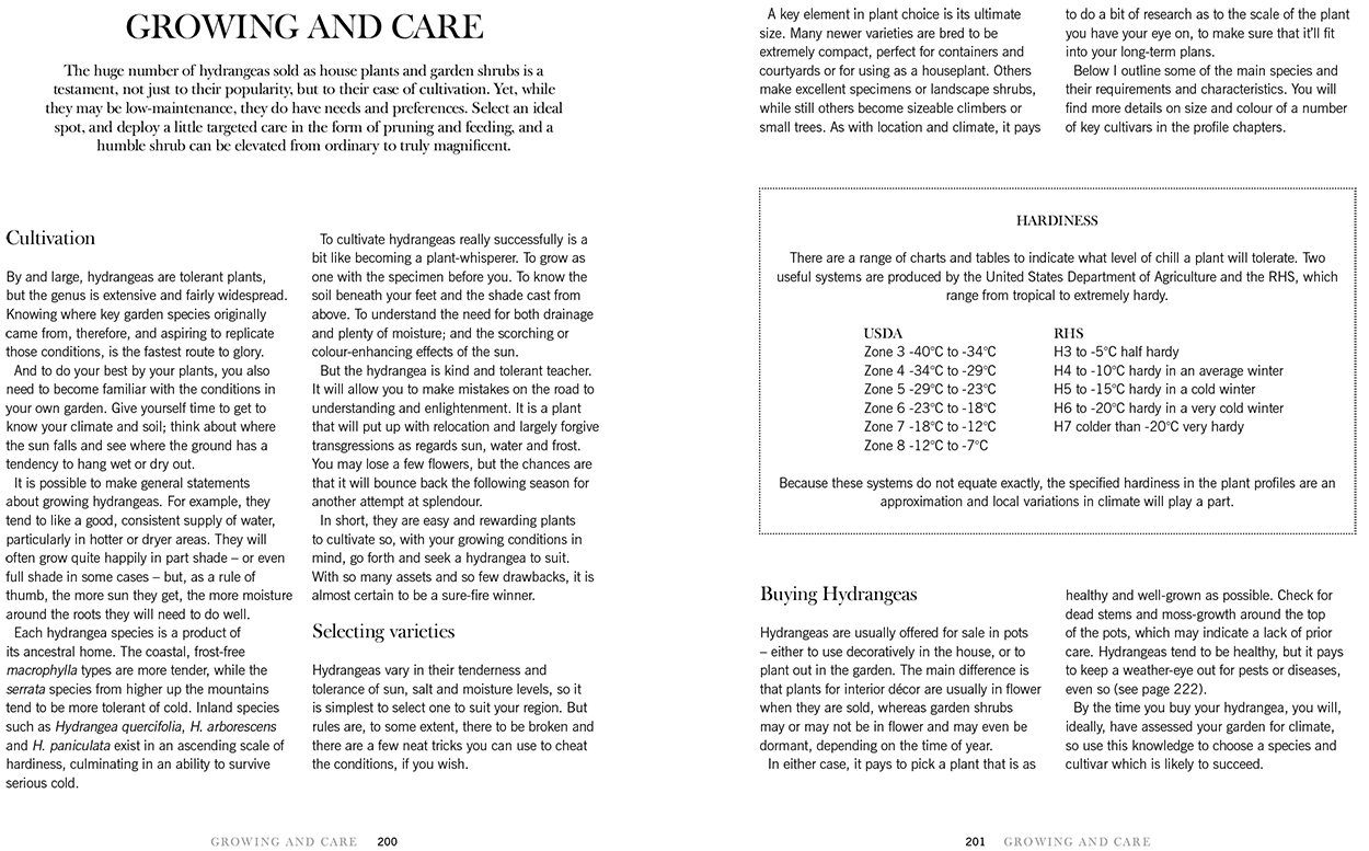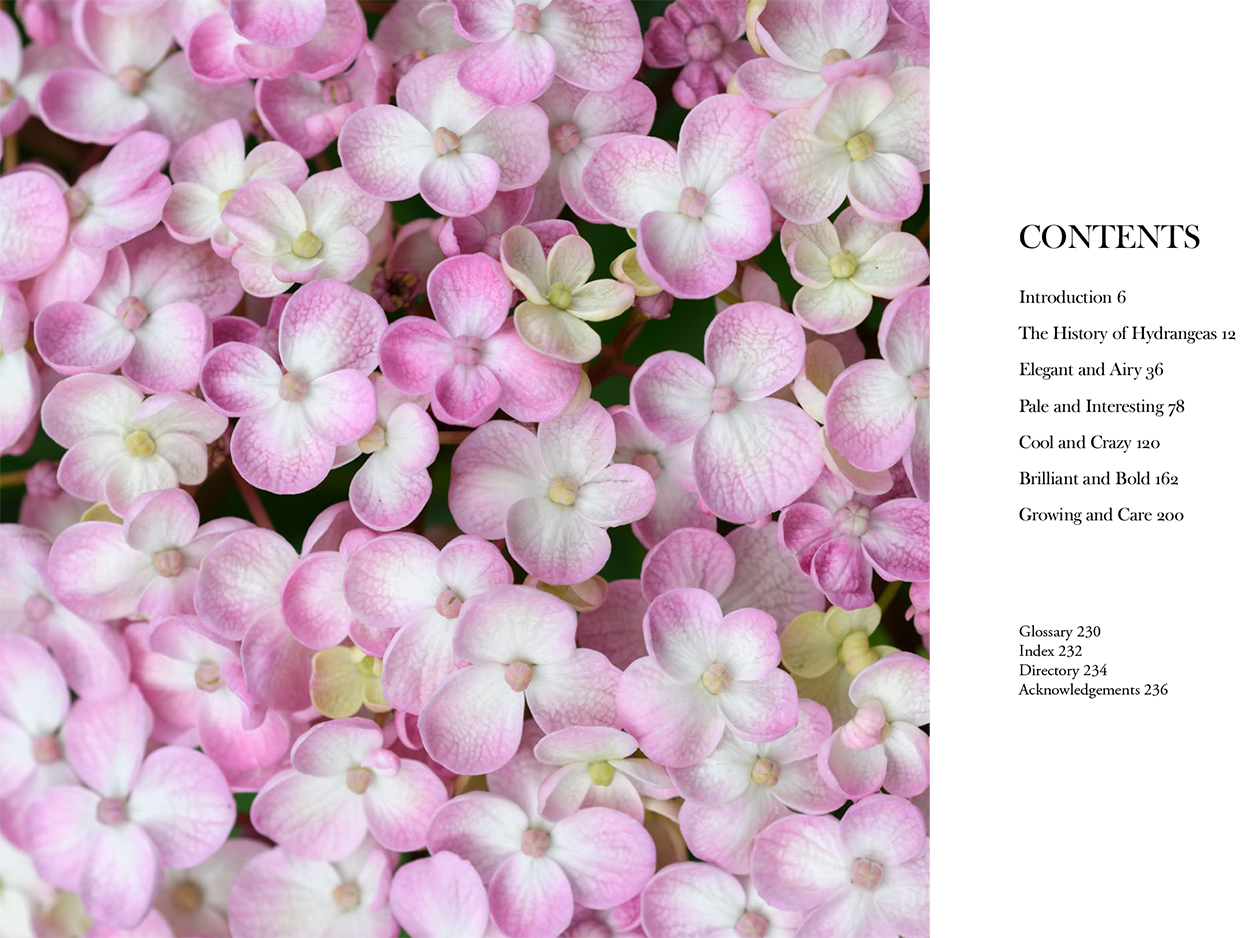 The Contents include: Introduction, The History and Cultivation of Hydrangeas, followed by a categorisation of Hydrangeas into the following groupings, Elegant and Airy, Pale and Interesting, Cool and Crazy, Brilliant and Bold, and finally Hydrangea Growing and Care.