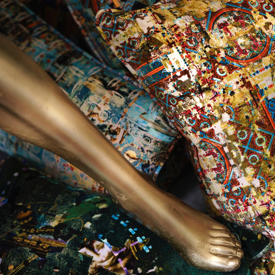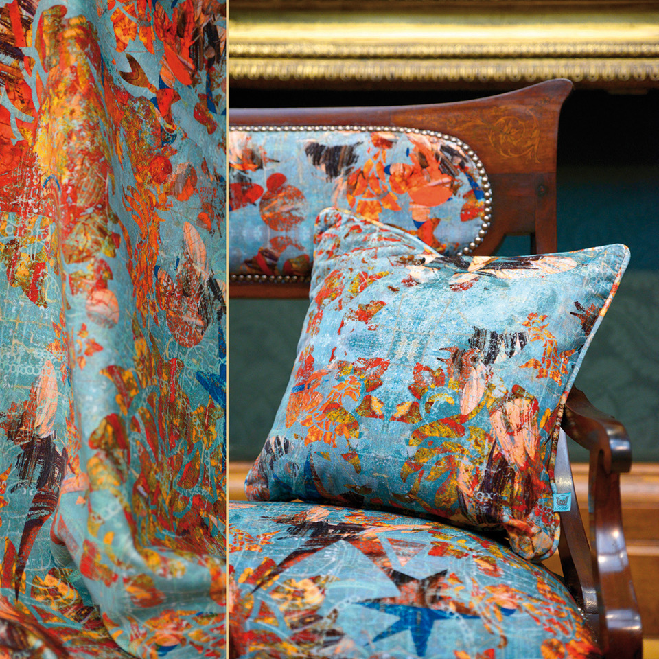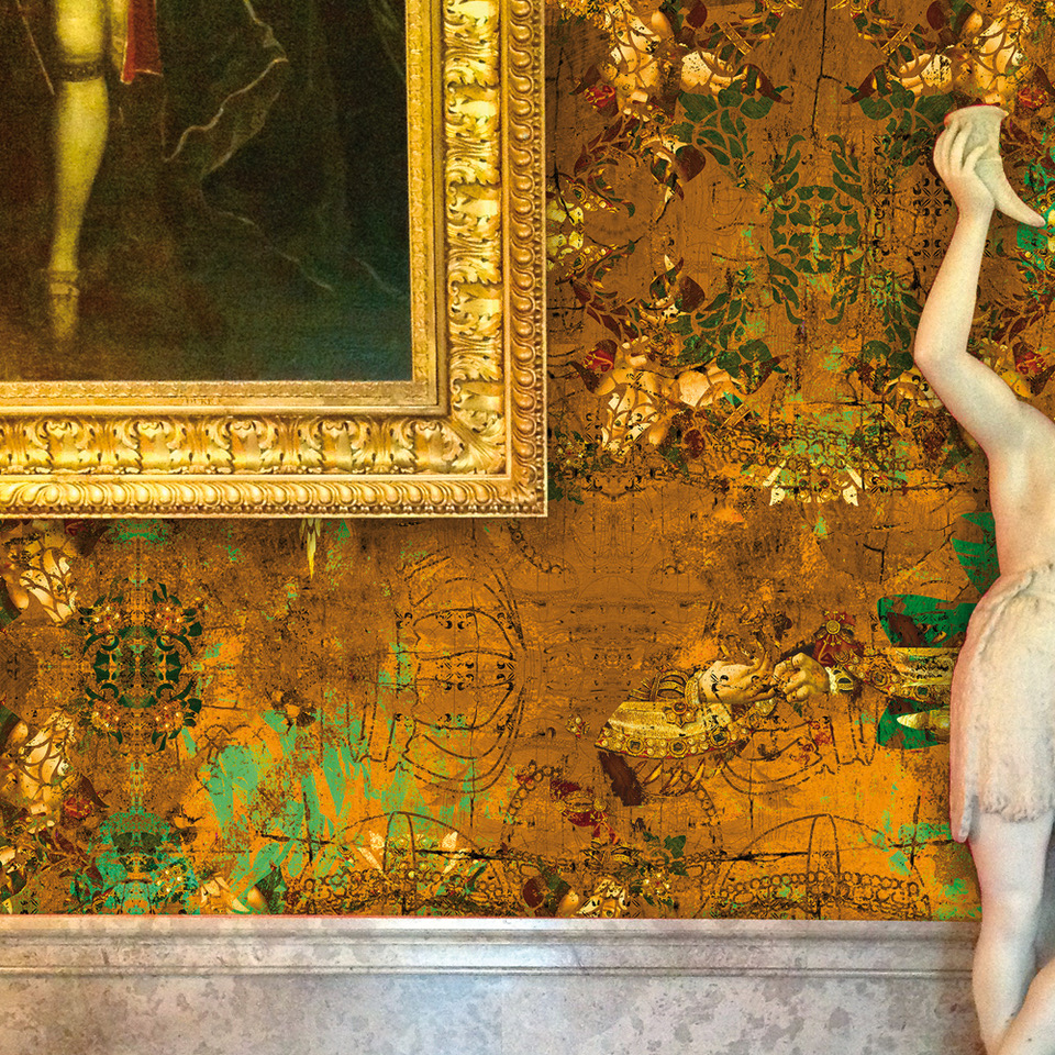 For the ‘Tudors Deconstructed’ collection we worked with the National Portrait Gallery’s world renowned collection of Tudor portraits where we were sent high-resolution images, some made microscopically and others with state of the art cameras. These became our digital palette. Then I had to think how to deconstruct [that word again] the portraits as I didn’t want to simply replicate them. I made painterly textured backgrounds, embedding graphics of crowns and orbs that I made in Illustrator, then I decided to draw Kandinsky/Miro like shapes and fill them with the pigments/pixels from the portraits. All of these elements sit on different layers, so you have control over each element, which allows you to play around until you think it’s finished.